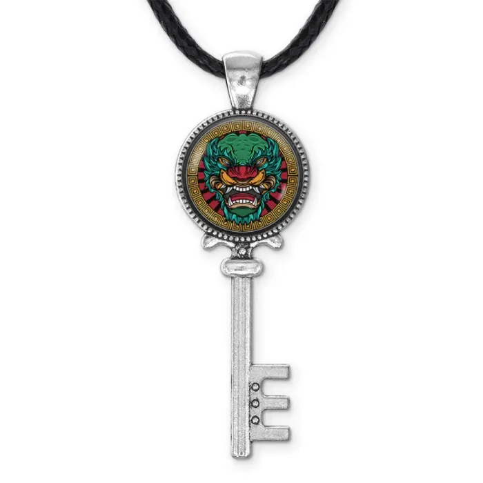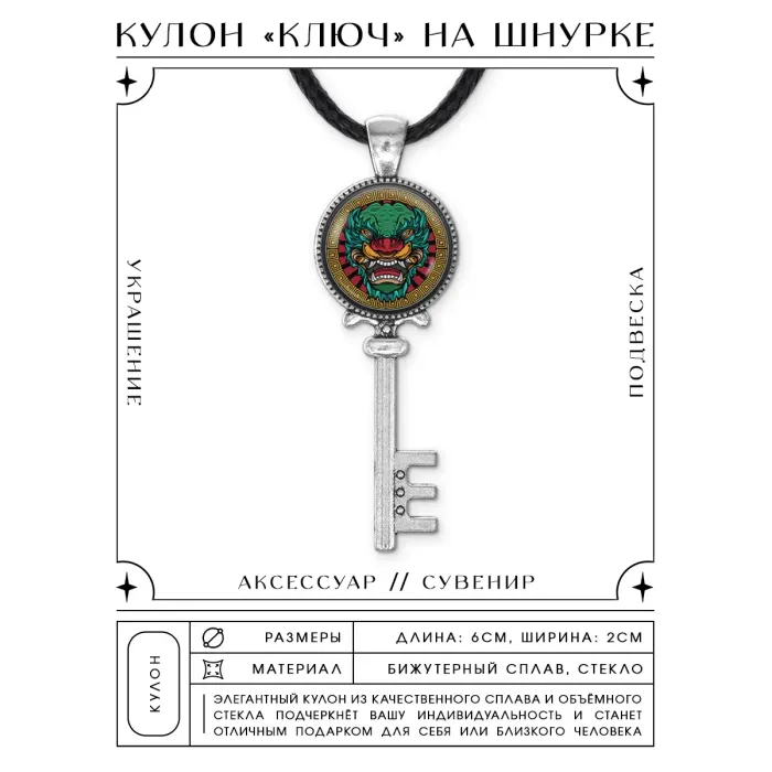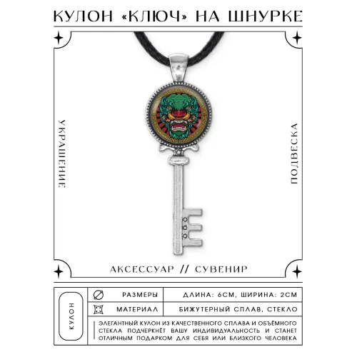 Кулон-ключ в виде дракона, выполненный из бижутерного сплава с серебристым покрытием и выпуклой стеклянной линзой.
