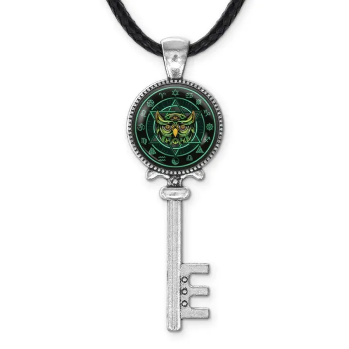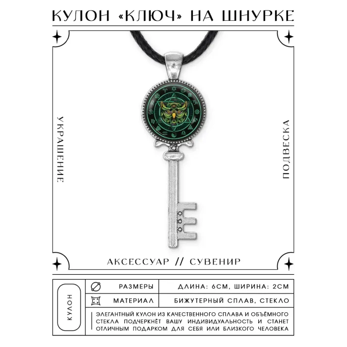 Кулон-ключ в виде совы из бижутерного сплава с покрытием под серебро и выпуклой стеклянной линзой.