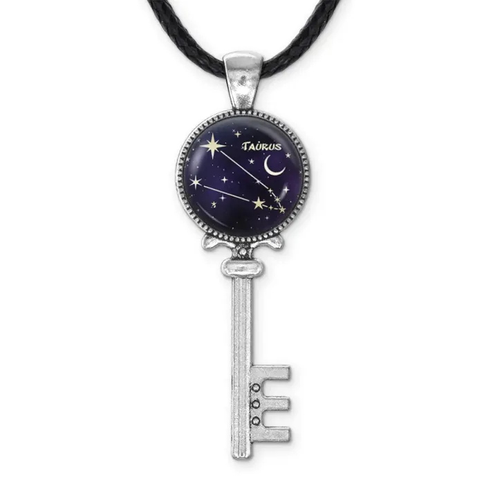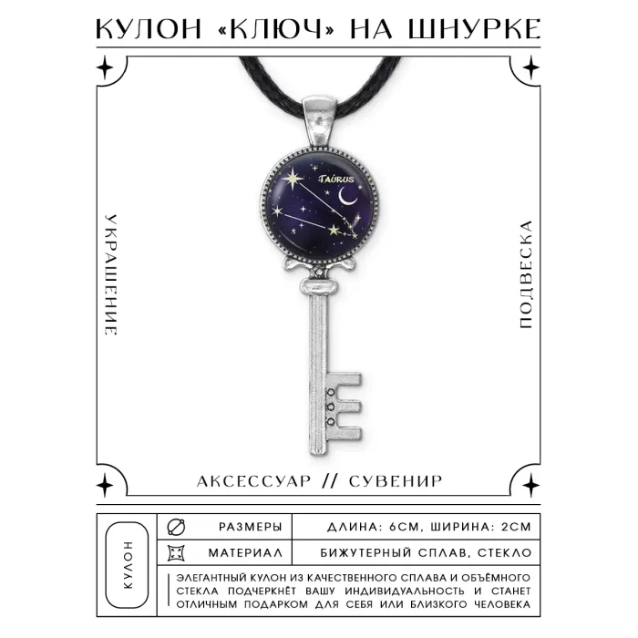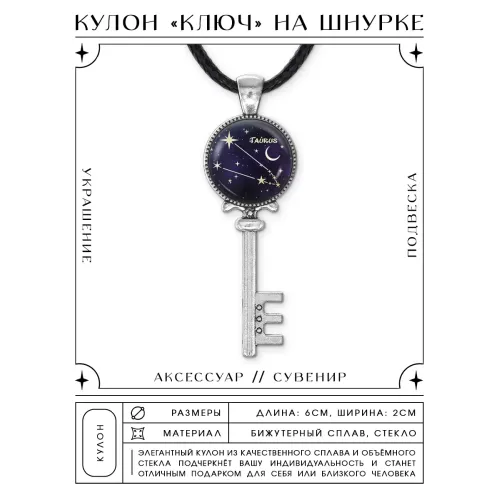Сувенирный кулон в виде ключа со знаком зодиака Телец, выполненный из бижутерного сплава.