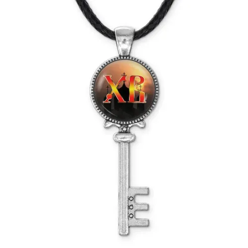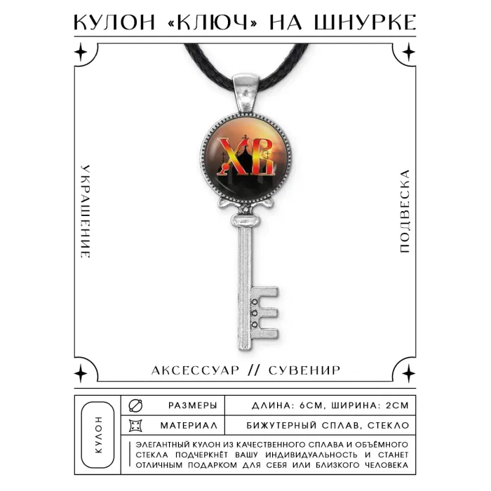 Кулон «Ключ Христос воскрес!» — сувенирный амулет из бижутерного сплава с покрытием под серебро. Изображение защищено выпуклой стеклянной линзой.