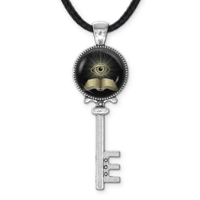 Сувенирный кулон в виде ключа с символикой тайных знаний. Материал — бижутерный сплав с покрытием под серебро, изображение защищено выпуклой стеклянной линзой.