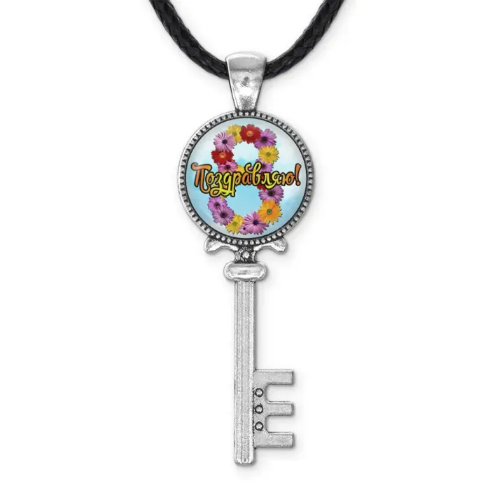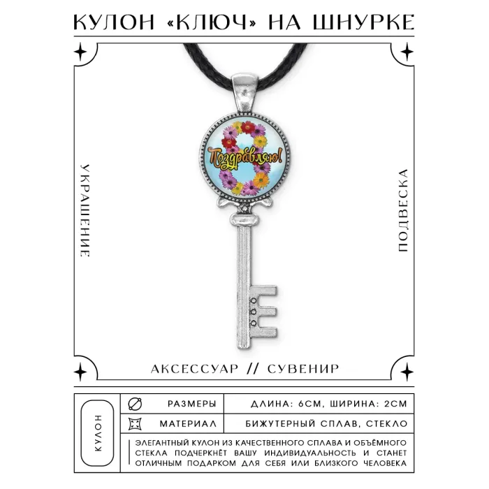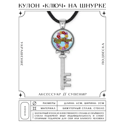 Кулон «Ключ Поздравляю!» из бижутерного сплава с покрытием под серебро и выпуклой стеклянной линзой.
