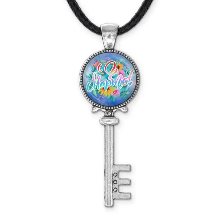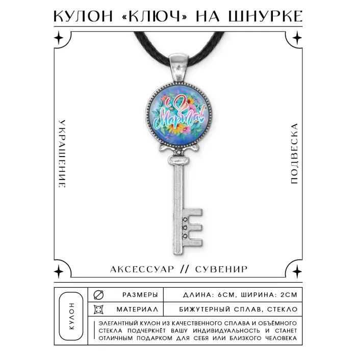 Кулон в виде ключа с тематикой 8 Марта. Изготовлен из бижутерного сплава с покрытием под серебро, изображение защищено выпуклой стеклянной линзой.