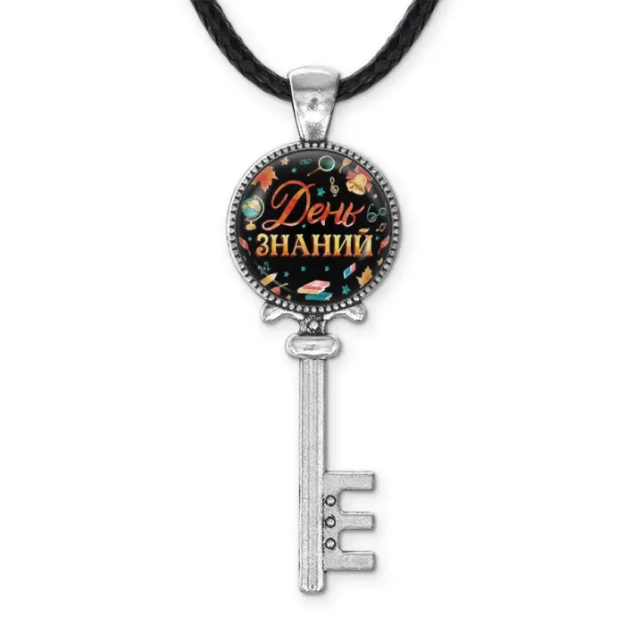 Кулон в виде ключа с тематикой Дня знаний. Изготовлен из бижутерного сплава с покрытием под серебро, изображение защищено выпуклой стеклянной линзой.