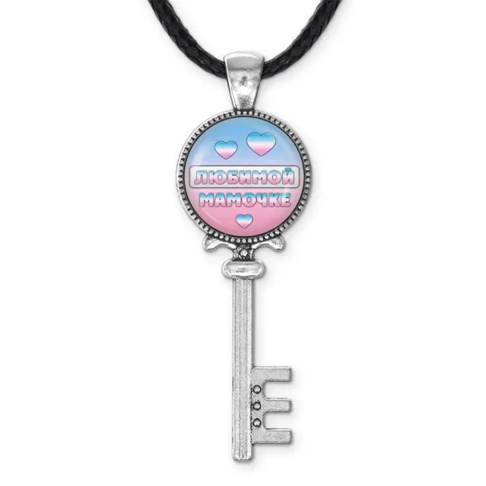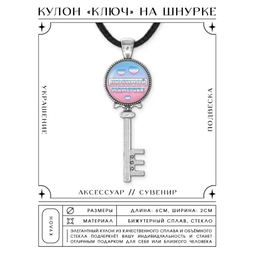 Кулон «Ключ Любимой мамочке» — сувенирный амулет из бижутерного сплава с покрытием под серебро и защитой изображения стеклянной линзой.
