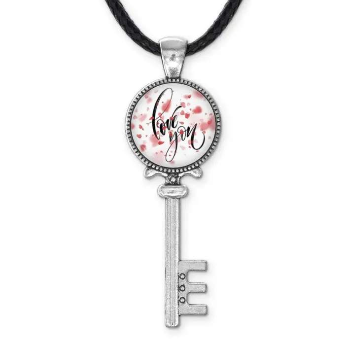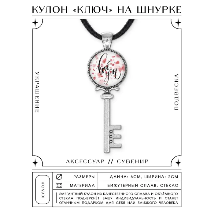 Сувенирный кулон в виде ключа с надписью «Я тебя люблю». Изготовлен из бижутерного сплава с покрытием под серебро, изображение защищено выпуклой стеклянной линзой.