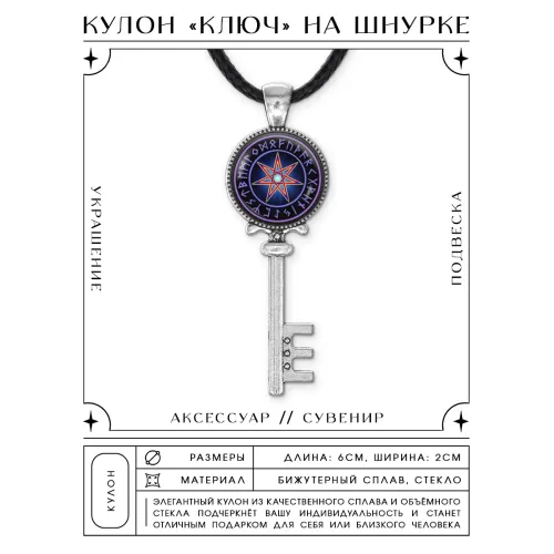 Кулон-сувенир из бижутерного сплава с изображением ключа и звезды магов под выпуклой стеклянной линзой.