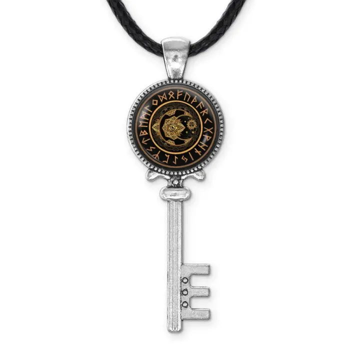 Кулон-ключ с символикой месяца и солнца из бижутерного сплава с покрытием под серебро. Изображение защищено выпуклой стеклянной линзой.