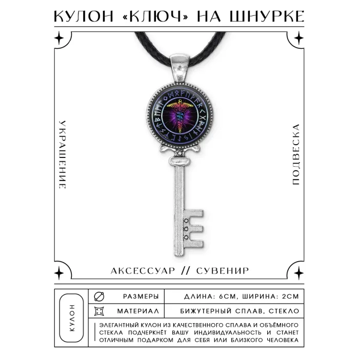 Кулон-сувенир из бижутерного сплава в виде ключа с изображением кадуцея.