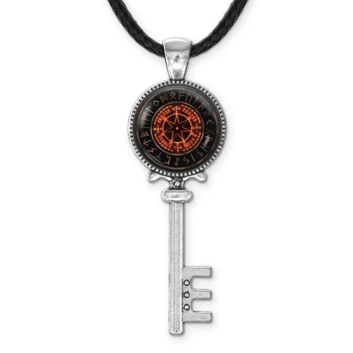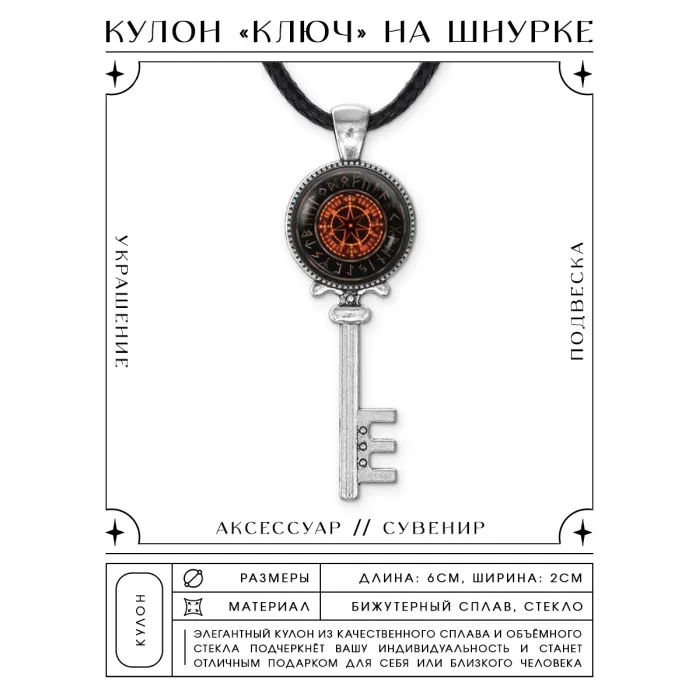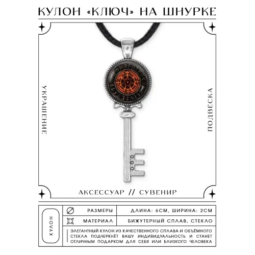 Кулон-ключ из бижутерного сплава с покрытием под серебро и защищённым стеклянной линзой изображением.