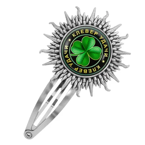 Заколка для волос из бижутерного сплава с изображением клевера под выпуклой стеклянной линзой.