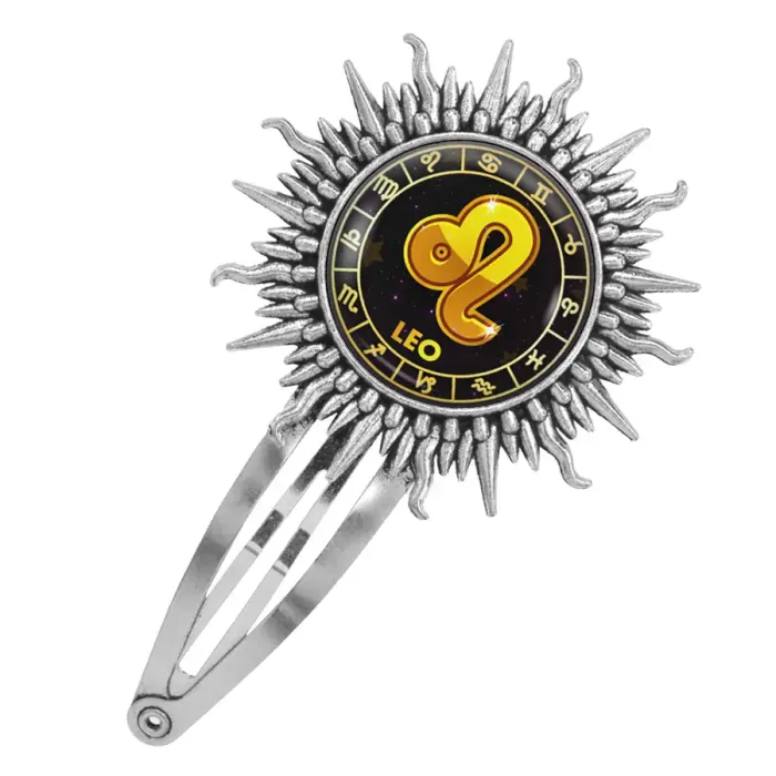 Заколка для волос с изображением знака зодиака Лев. Изготовлена из бижутерного сплава с покрытием под серебро, изображение защищено выпуклой стеклянной линзой.