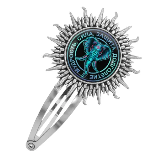 Заколка для волос в виде слона из бижутерного сплава с изображением под стеклянной линзой.