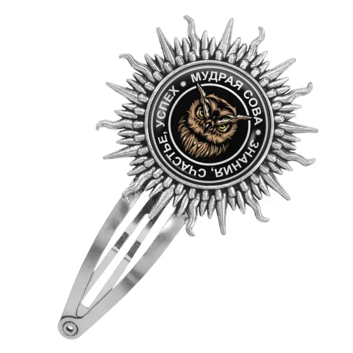 Заколка для волос с декоративным элементом в виде совы. Изготовлена из бижутерного сплава с покрытием под серебро, изображение защищено выпуклой стеклянной линзой.