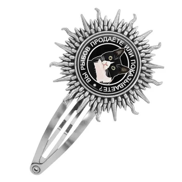 Размеры и комплектация: Размер заколки 77х45 мм. Диаметр изображения 25 мм. Упаковка — прозрачный пакет.