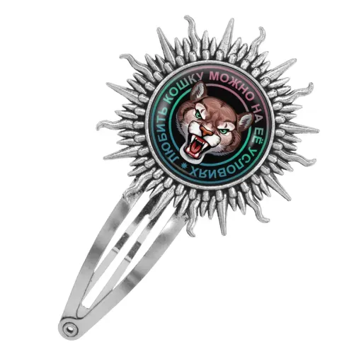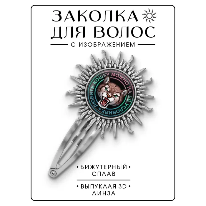 Размеры и комплектация: Размер заколки 77х45 мм, диаметр изображения 25 мм. Упаковка: прозрачный пакет.