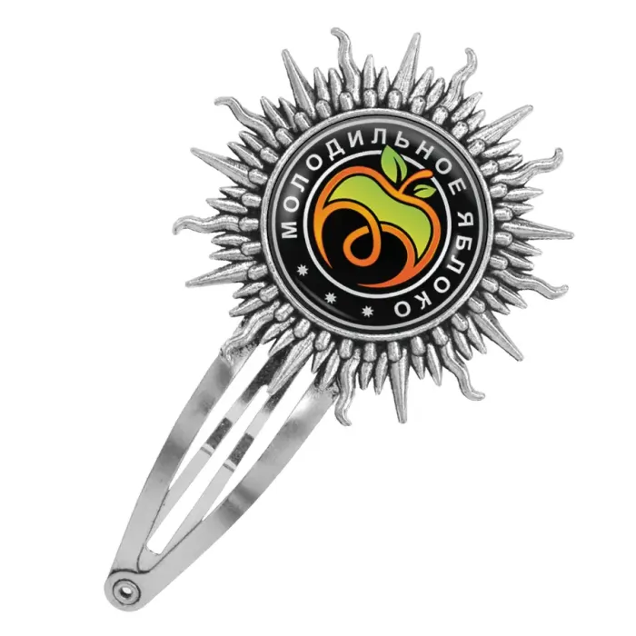 Заколка «Молодильное яблоко» — аксессуар из бижутерного сплава с покрытием под серебро и изображением под стеклянной линзой.