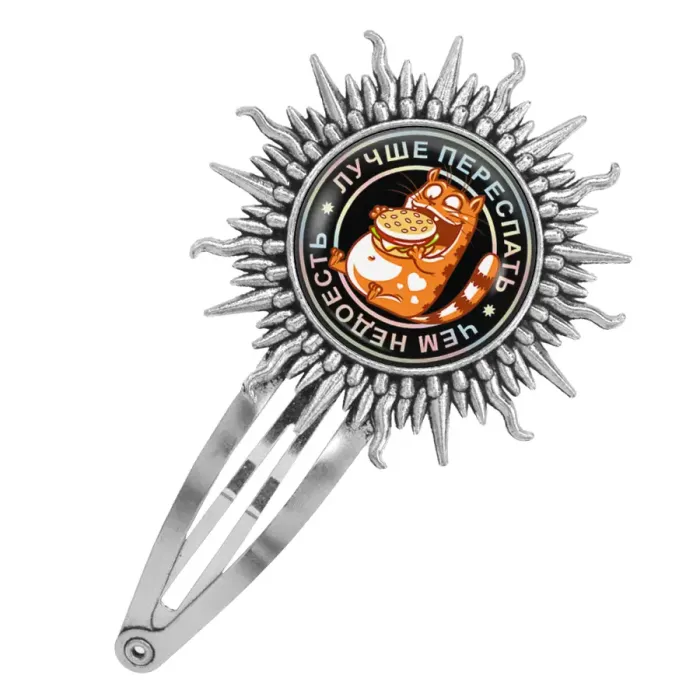 Размеры и комплектация: Размер заколки: 77х45 мм. Диаметр изображения: 25 мм. Упаковка: прозрачный пакет.