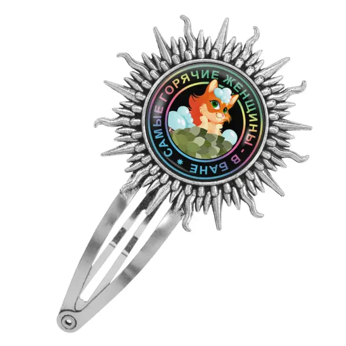 Размеры и комплектация: Размер заколки 77х45 мм, диаметр изображения 25 мм. Упаковка: прозрачный пакет.