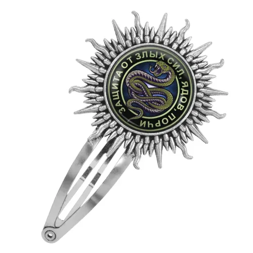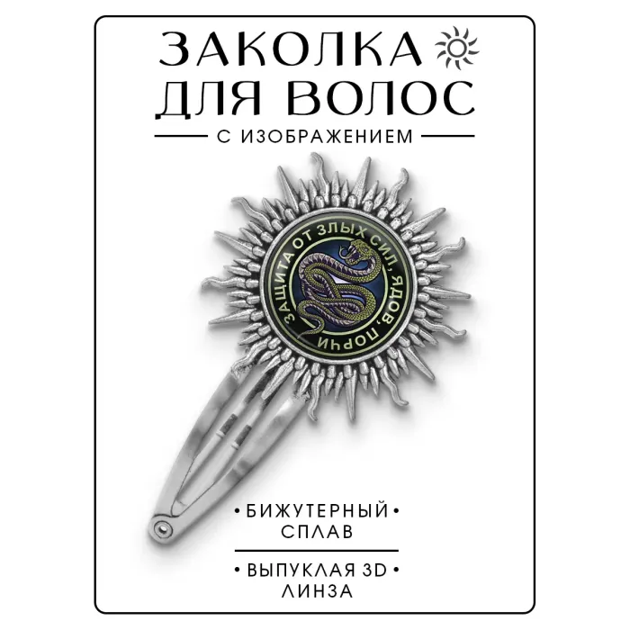 Заколка для волос из бижутерного сплава с декоративным элементом в виде змеи под стеклянной линзой.