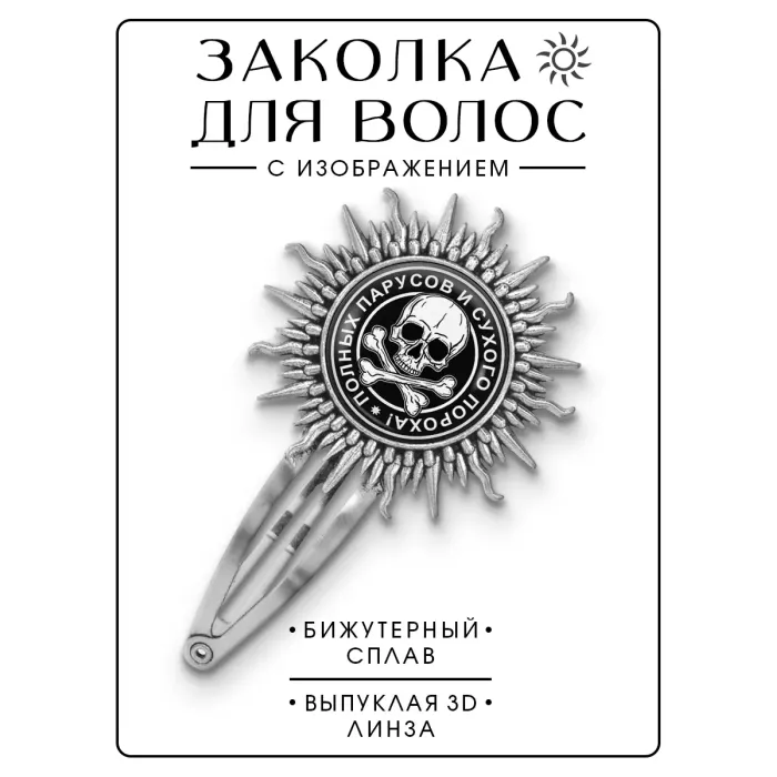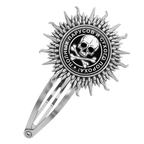 Заколка для волос из бижутерного сплава с изображением Весёлого Роджера под выпуклой стеклянной линзой.
