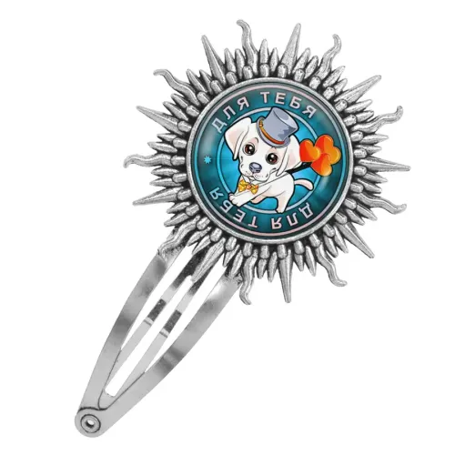 Заколка для волос из бижутерного сплава с покрытием под серебро и изображением под выпуклой стеклянной линзой.