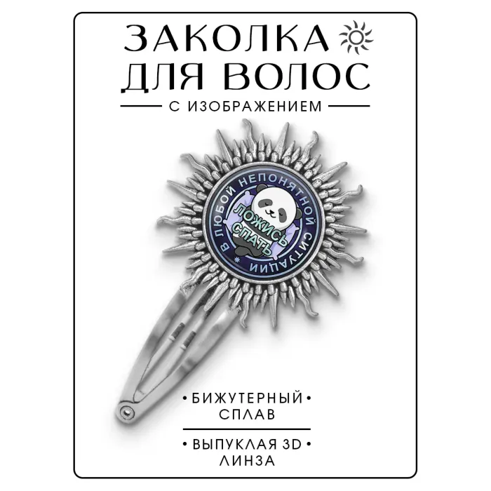 Размеры и комплектация: Размер заколки 77х45 мм, диаметр изображения 25 мм. Упаковка: прозрачный пакет.