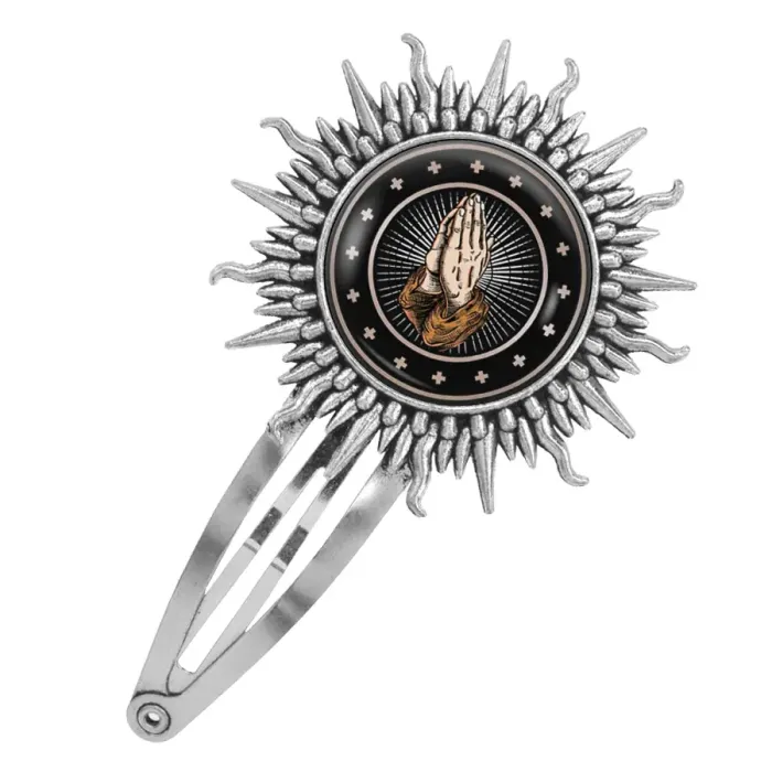 Заколка для волос из бижутерного сплава с изображением под стеклянной линзой.