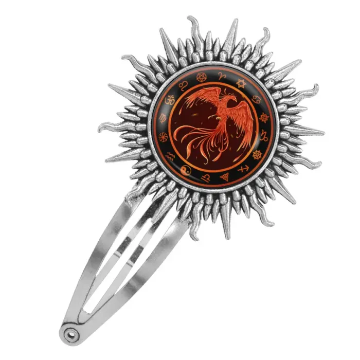Заколка для волос из бижутерного сплава с изображением феникса под стеклянной линзой.