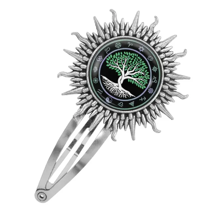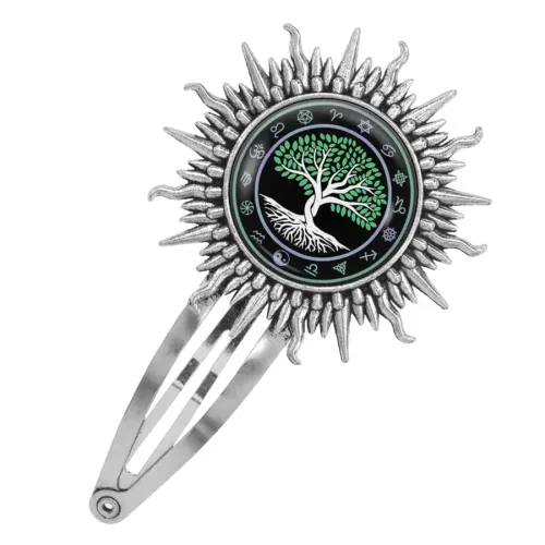 Заколка для волос из бижутерного сплава с дизайном «Два дерева» под стеклянной линзой.