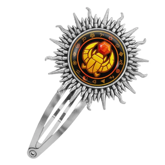 Заколка для волос в виде скарабея из бижутерного сплава с покрытием под серебро и выпуклым стеклянным элементом.