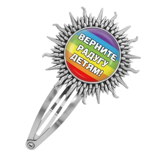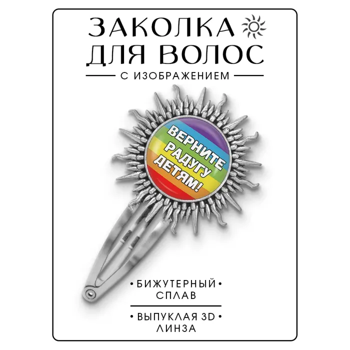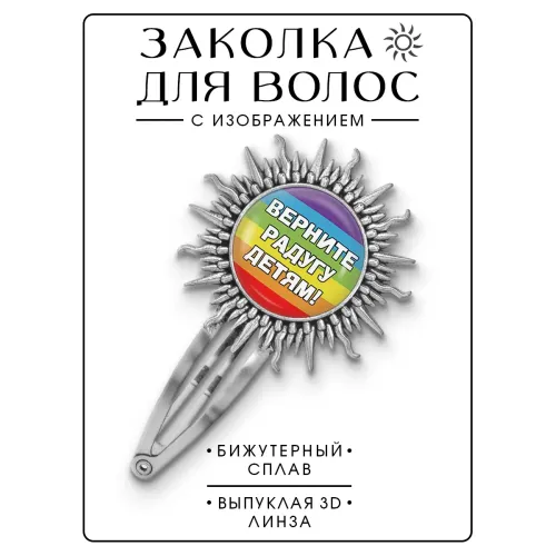 Размеры и комплектация: Размер заколки 77х45 мм, диаметр изображения 25 мм. Упаковка — прозрачный пакет.