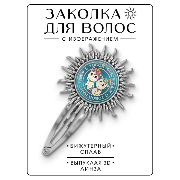 Размеры и комплектация: Размер заколки 77х45 мм, диаметр изображения 25 мм. Упаковка: прозрачный пакет.