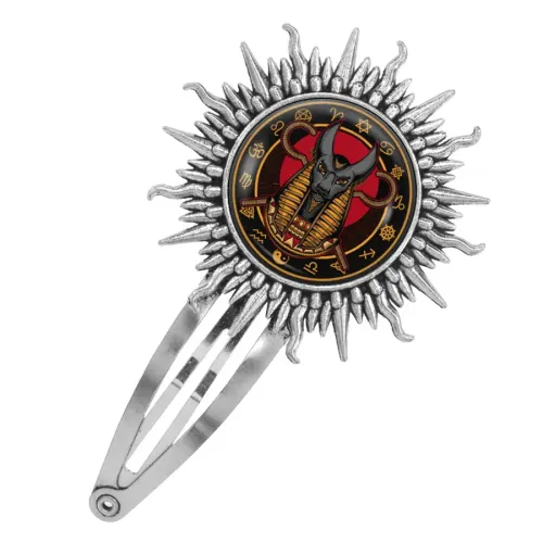 Заколка для волос из бижутерного сплава с изображением Анубиса под выпуклой стеклянной линзой.