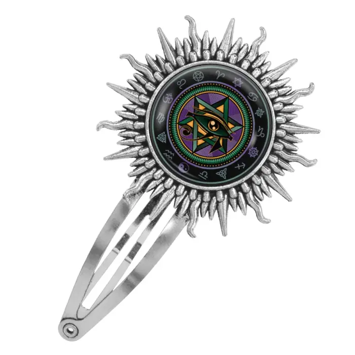 Заколка для волос из бижутерного сплава с изображением Ока Гора под стеклянной линзой.