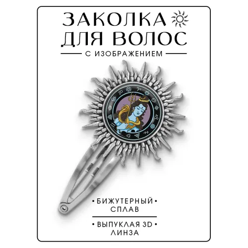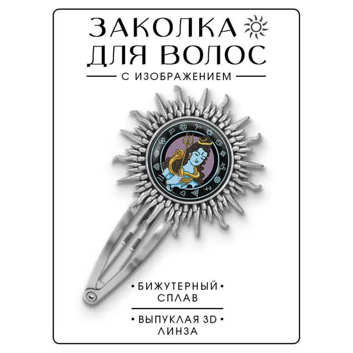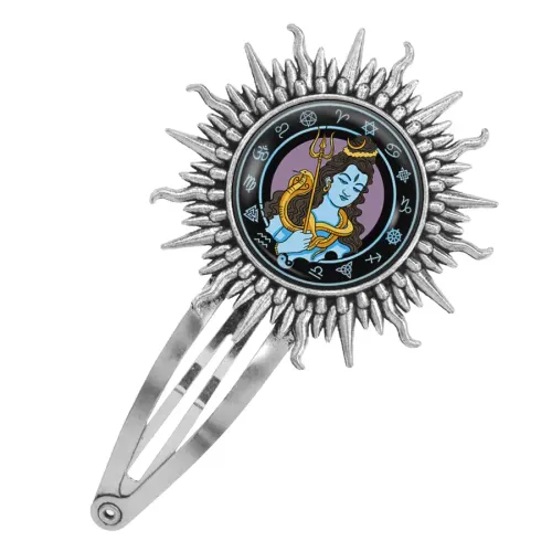 Заколка для волос из бижутерного сплава с изображением Шива под выпуклой стеклянной линзой.