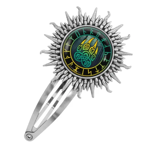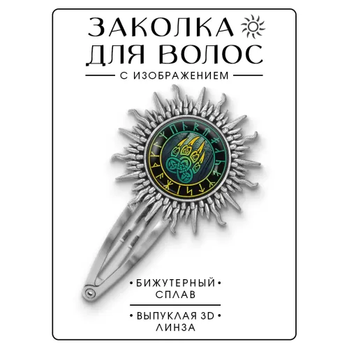 Заколка для волос с символом Печать Велеса. Изготовлена из бижутерного сплава с покрытием под серебро, изображение защищено выпуклой стеклянной линзой.
