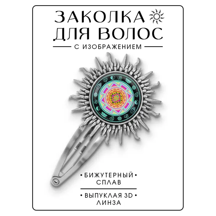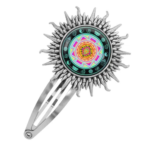 Заколка для волос из бижутерного сплава с изображением Шри-янтры под стеклянной линзой.