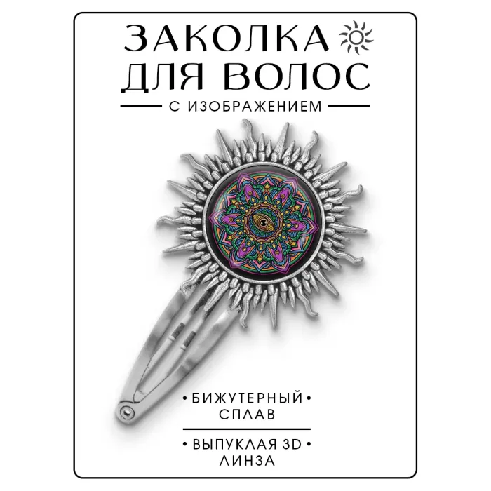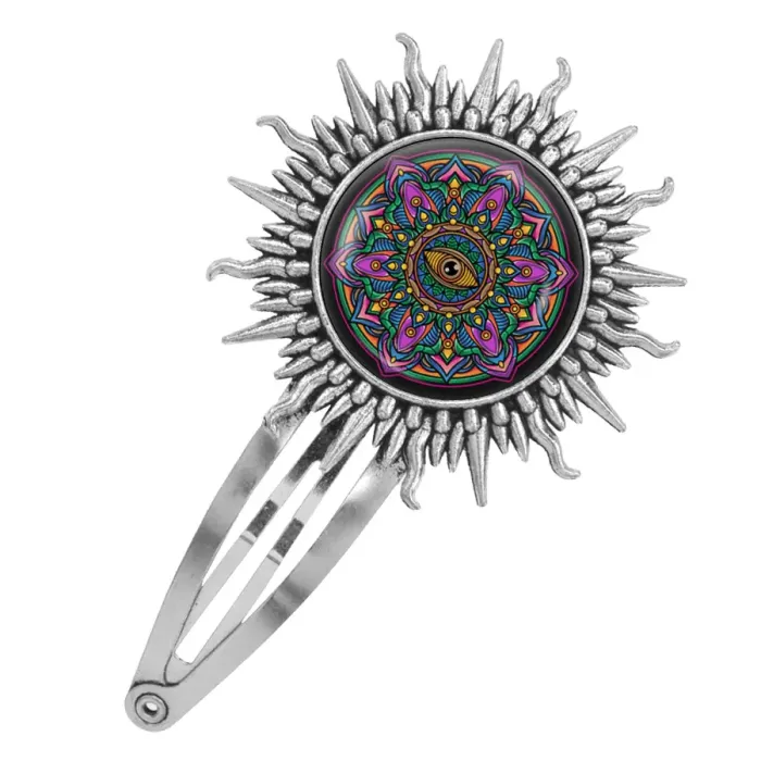 Заколка для волос из бижутерного сплава с изображением мандалы и глаза под стеклянной линзой.