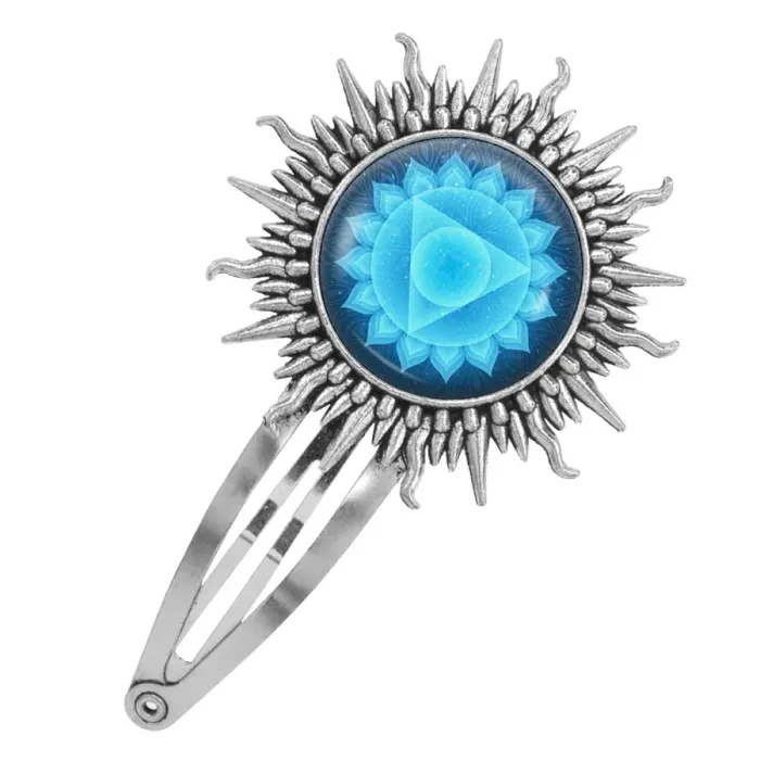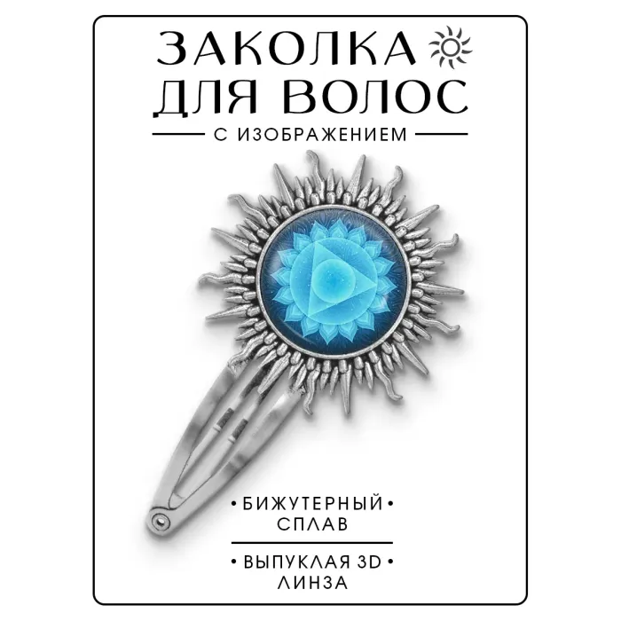 Заколка с изображением Вишуддха чакры. Изготовлена из бижутерного сплава с покрытием под серебро, дизайн защищен выпуклой стеклянной линзой.