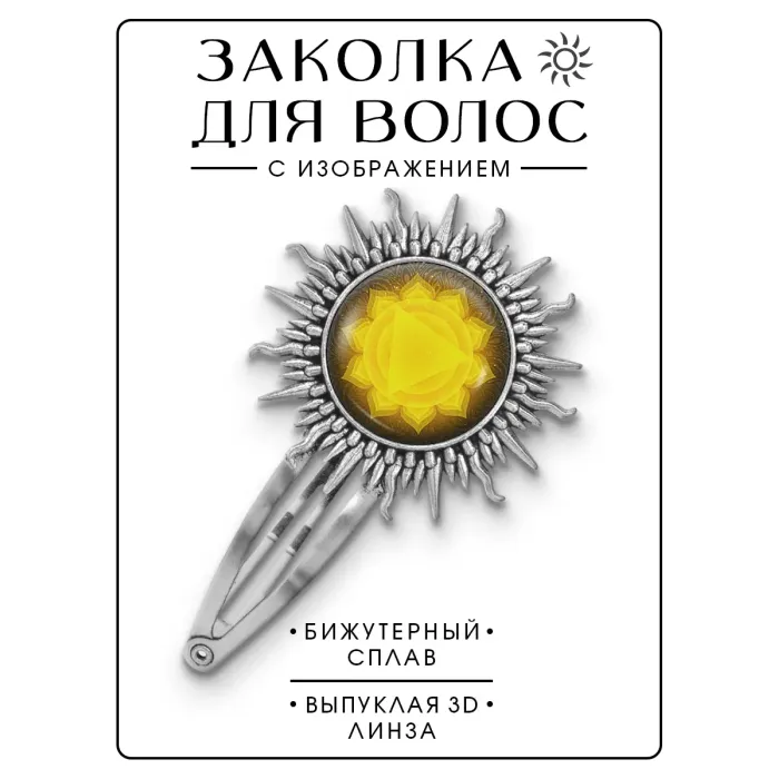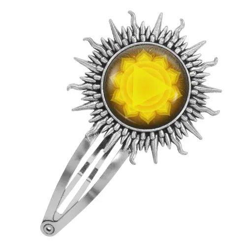 Заколка для волос с изображением чакры Манипура. Изготовлена из бижутерного сплава с серебристым покрытием, изображение защищено выпуклой стеклянной линзой.
