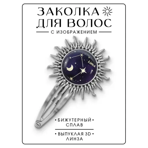 Заколка с изображением знака зодиака Весы. Изготовлена из бижутерного сплава с покрытием под серебро, изображение защищено выпуклой стеклянной линзой.