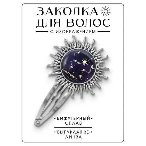 Заколка для волос с астрологической символикой знака Стрелец. Изготовлена из бижутерного сплава с серебристым покрытием, дизайн защищён стеклянной линзой.