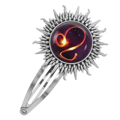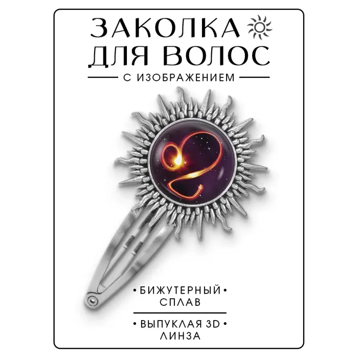 Заколка для волос с изображением знака зодиака Лев. Изготовлена из бижутерного сплава с серебристым покрытием, изображение защищено выпуклой стеклянной линзой.