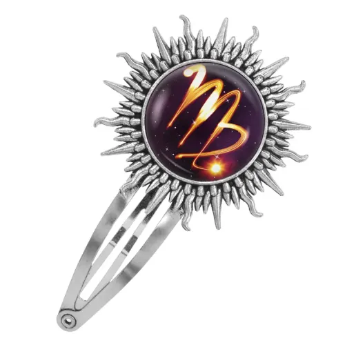 Заколка с изображением знака зодиака Дева. Изготовлена из бижутерного сплава с покрытием под серебро, изображение защищено выпуклой стеклянной линзой.