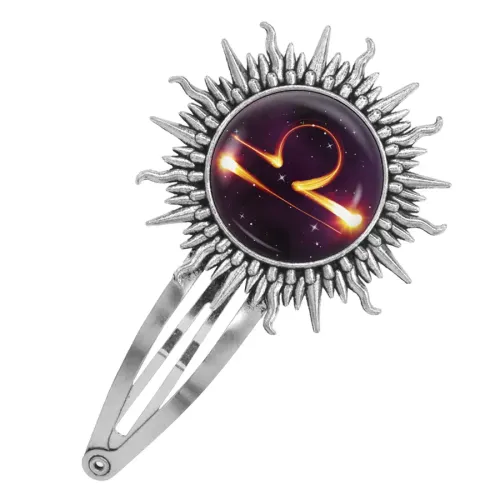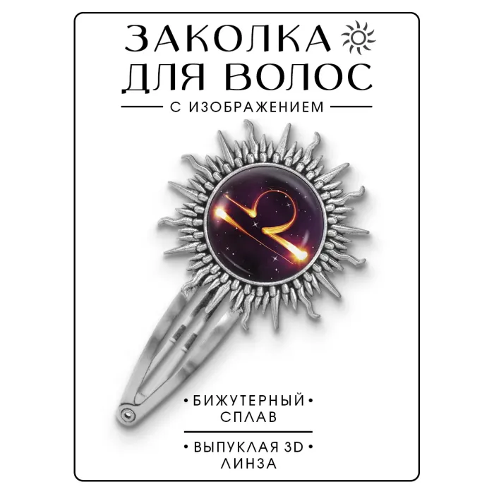 Заколка для волос с символом знака зодиака Весы. Изготовлена из бижутерного сплава с покрытием под серебро, изображение защищено выпуклой стеклянной линзой.