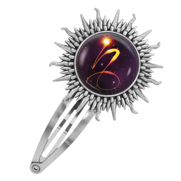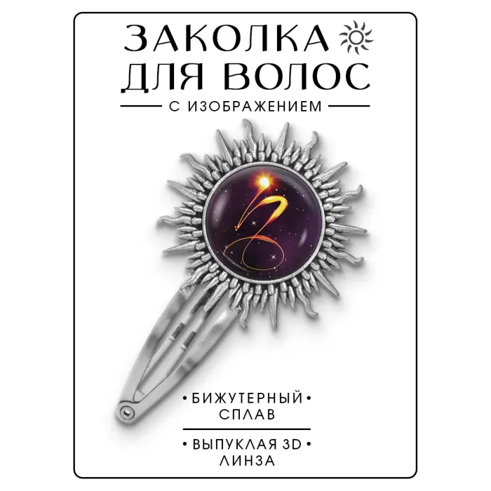 Размеры и комплектация: Размер заколки 77х45 мм. Диаметр изображения знака зодиака — 25 мм. Упаковка — прозрачный пакет.