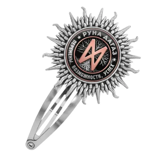 Заколка с символом руны Дагаз. Изготовлена из бижутерного сплава с покрытием под серебро, изображение защищено стеклянной линзой.