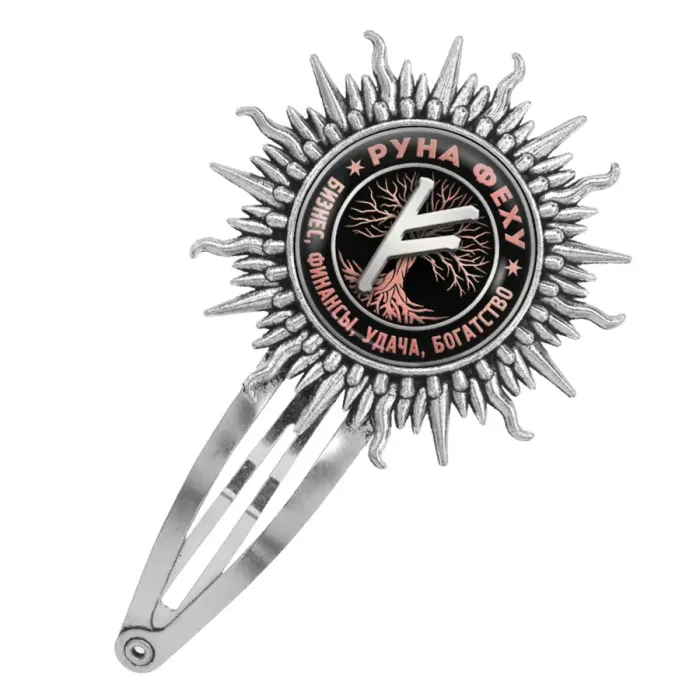 Заколка с символом руны Феху. Изготовлена из бижутерного сплава с покрытием под серебро, изображение защищено выпуклой стеклянной линзой.