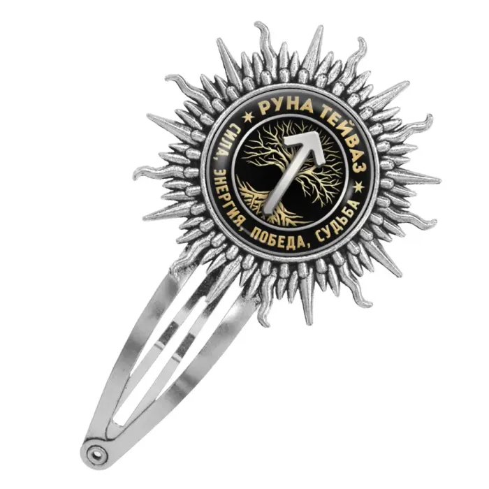 Заколка с изображением руны Тейваз. Изготовлена из бижутерного сплава с покрытием под серебро, изображение защищено выпуклой стеклянной линзой.